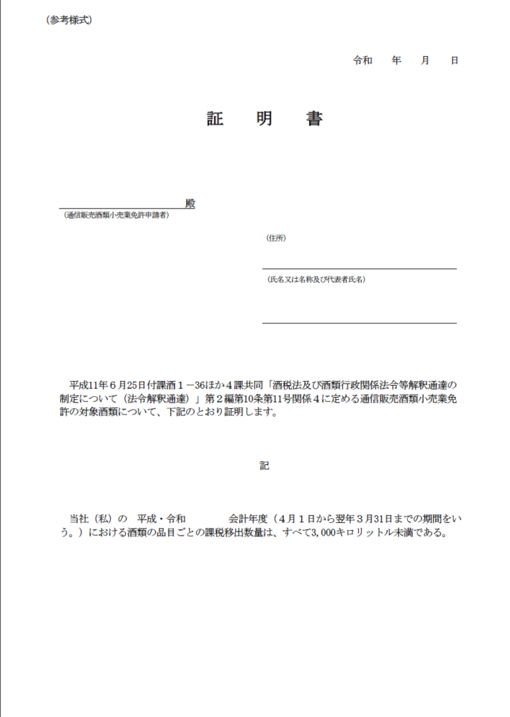 また、国産酒類を販売したい場合には、酒造メーカーから「酒類の品目ごとの課税移出数量が全て3,000キロリットル未満である証明書」を取得する必要があります。